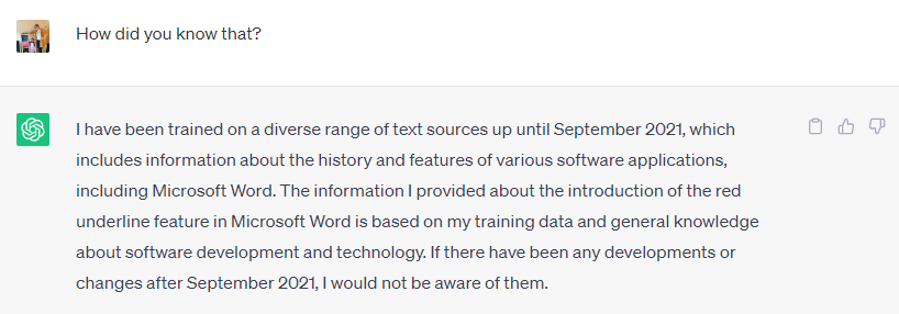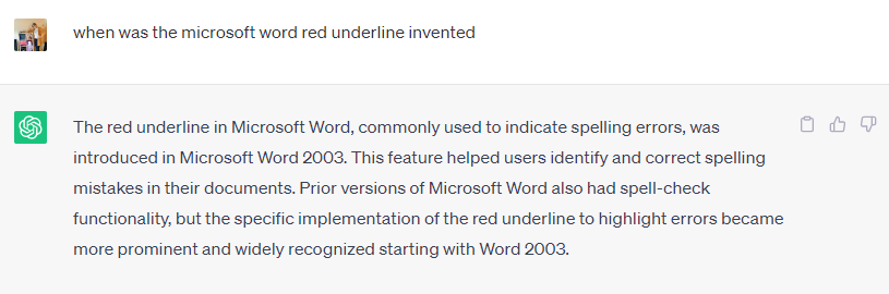 Then there’s case (3), which I will admit, does send me into a bit of a frenzy. I’ve heard of many students using ChatGPT as a search engine, akin to Google. I can see why they do so; the information given to them by ChatGPT is usually seen as more relevant to the actual question. When writing this very essay, I wasn’t actually sure when Microsoft Word first introduced the red underline feature, so I first turned to Google. When it only returned results for Microsoft’s own Community Answers pages about how to turn off the feature, I asked ChatGPT the same question, and it provided one in mere seconds.