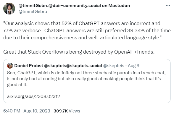 This all gets even worse when you consider that ChatGPT can simply be wrong sometimes. In fact, it can be wrong more often than not: a study published this week compared ChatGPT responses to Stack Overflow queries about software engineering, finding that 52% of the AI tool’s answers contained inaccuracies. Concerningly, these ChatGPT responses were still preferred by users nearly 40% of the time due to their “comprehensiveness and articulate language style”.