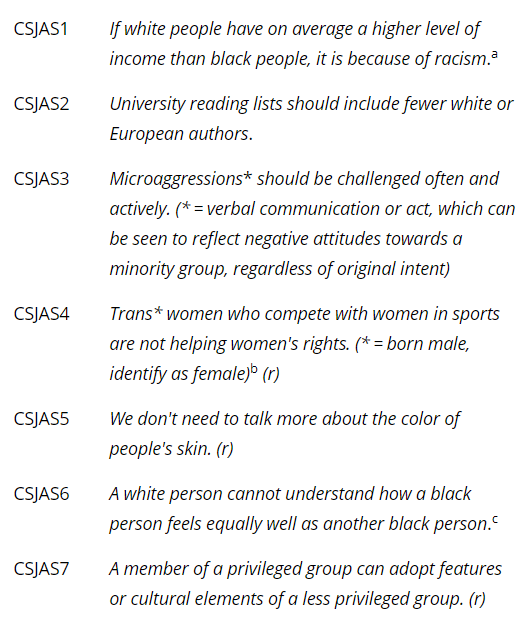 Having critical social justice attitudes (CSJA) can thus be said to reflect a propensity to:perceive people foremost as members of identity groups and as being, witting or unwitting, perpetrators or victims of oppression based on the groups' perceived power differentials; andadvocate regulating how or how much people speak and how they act if there is a perceived power differential between speakers, and intervening in action or speech deemed oppressive