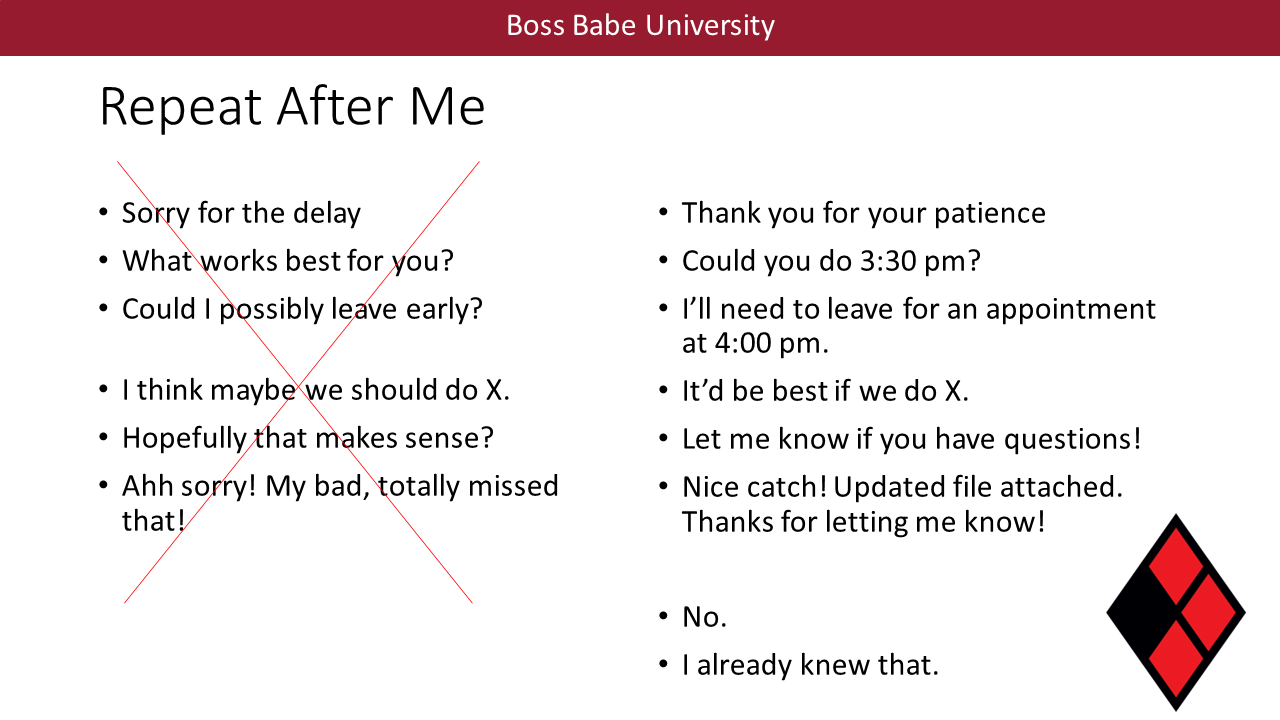 This particular piece of advice about asking for help is important to me, so I brought it up again the following week when I gave my Halloween lecture in-character as Harley Quinn. Yes, really. On Friday, October 28th, after the planned lecture about process control instrumentation, “our guest lecturer Dr. Harleen Quinzel” ended with some positive affirmations for the ChemE Seniors in my Process Control class. This included advice about cold-emailing professors for recommendation letters if you need them, writing your own rec letters in a way that avoids gendered bias, and phrases that’ll help these future workers (especially the women in the class) be assertive and confident in their future jobs. “Harley” did all this student empowerment while bouncing around the lecture hall, handing out candy, and swinging a bat around. (Side note: I love my job.)