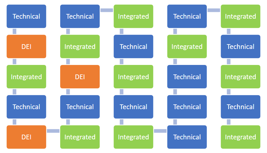 When instructors do agree to be a bit more flexible, it typically comes in the form of a “bonus lecture”, often at a convenient time during the semester such as right before Fall/Spring break or even on the very last day of class. Usually, the content this “DEI Day” (since all issues not strictly related to pure math are lumped together as “all that woke stuff”) is never reinforced in later lectures or assignments, if it’s ever discussed again at all. This paradigm is shown in the figure below, with each block representing a day or week of a typical STEM course. This approach does potentially expose students to new ideas, but it has its drawbacks, namely that students can easily skip this one lecture, either because they’re not interested or because they’ve already mentally checked out of the class. Even students who enjoy this non-technical content might not make the connection between this Fun Bonus Day and the material they’re learning in class. By not weaving social justice content into the very fabric of your course, the content will be lost on students, and may even backfire on you as students complain that you’re taking away from the “real” course content.