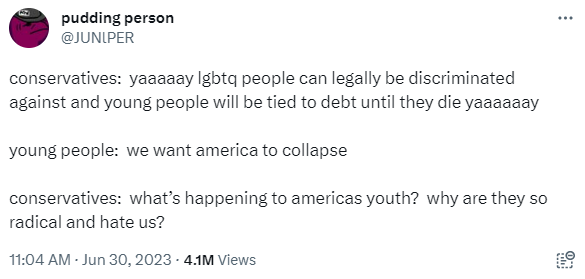 Tweet from user @JUNlPER. “conservatives: yaaaaay lgbtq people can legally be discriminated against and young people will be tied to debt until they die yaaaaaay. young people: we want america to collapse. conservatives: what’s happening to americas youth? why are they so radical and hate us?” (Twitter) (also, gotta love how Twitter embeds don’t work anymore since Elon took over!!)