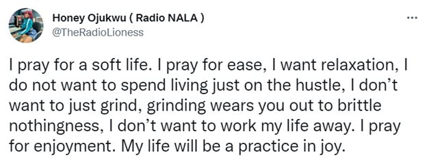 [Image Description: Tweet by @TheRadioLioness, “I pray for a soft life. I pray for ease, I want relaxation, I do not want to spend living just on the hustle, I don’t want to just grind, grinding wears you out to brittle nothingness, I don’t want to work my life away. I pray for enjoyment. My life will be a practice in joy.”]
