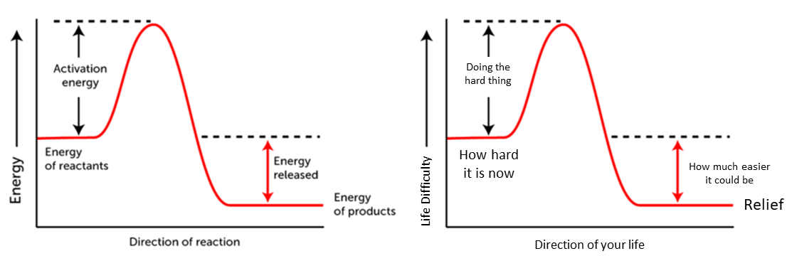 [Image Description: A diagram for Gibbs free energy for an exothermic reaction (left) and a diagram for why doing a hard thing can make your life easier (right).]