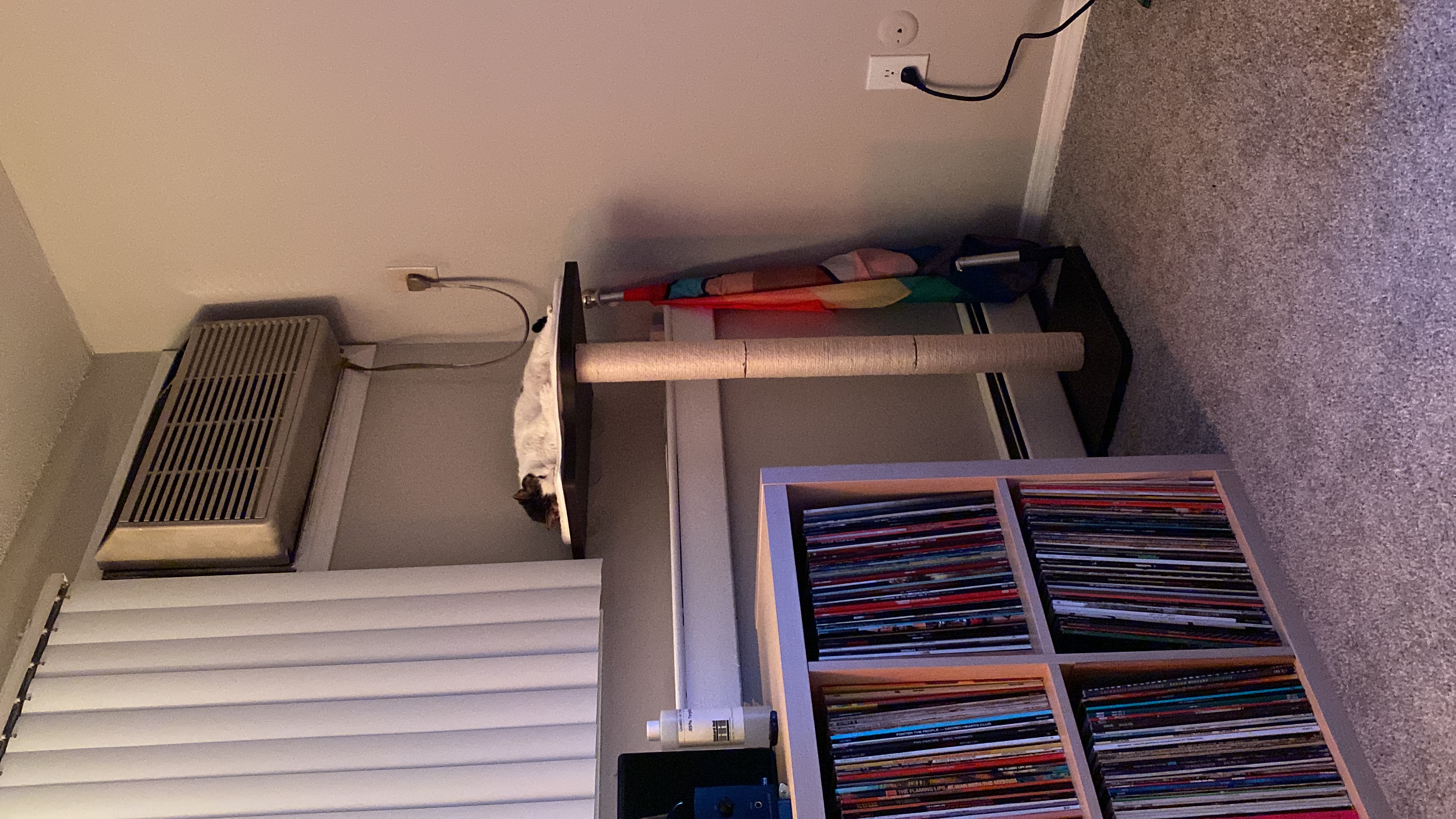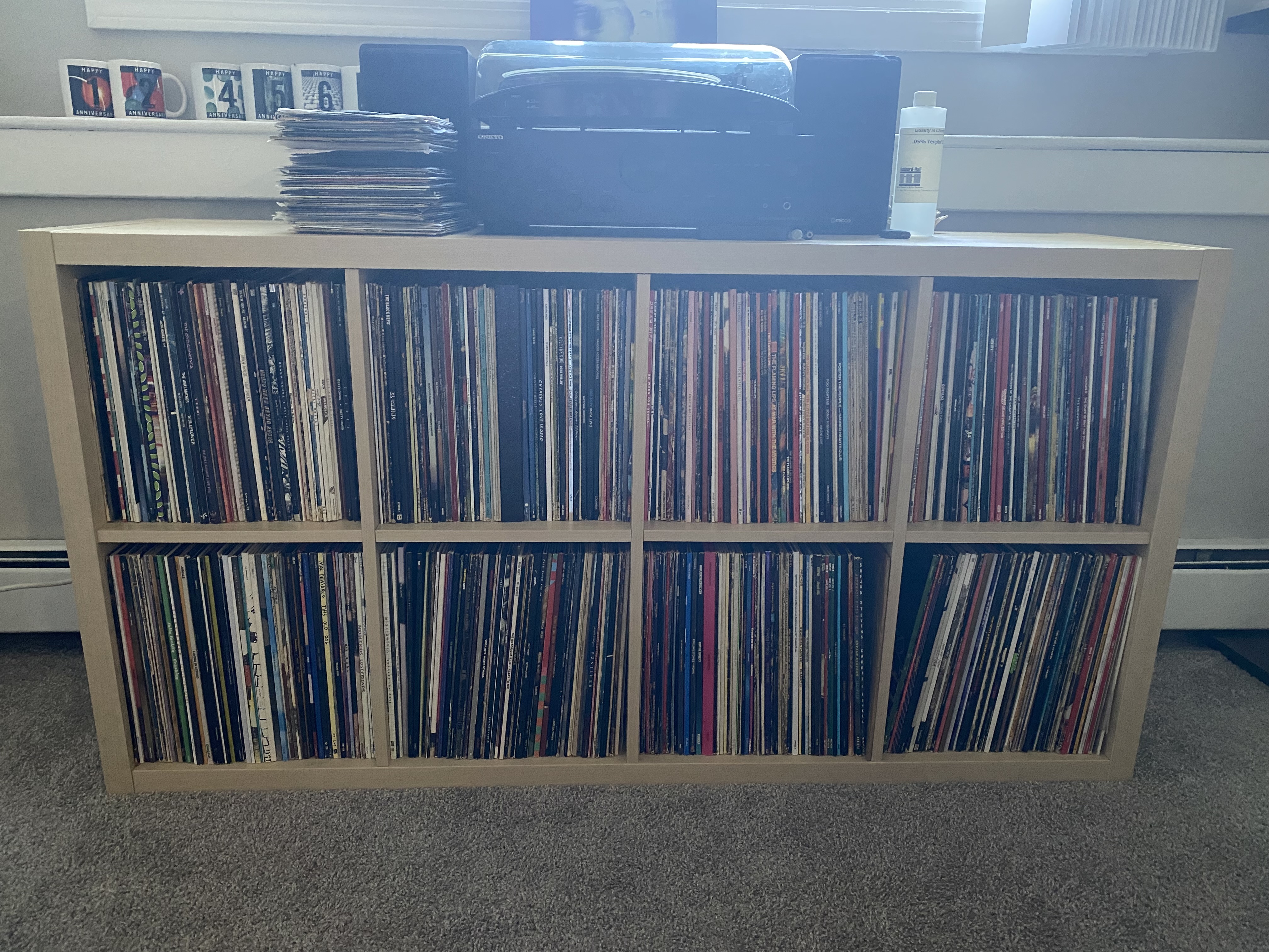 [Image description: my record collection in my new living room, its 500+ entries nearly bursting out of this IKEA KALLAX.]