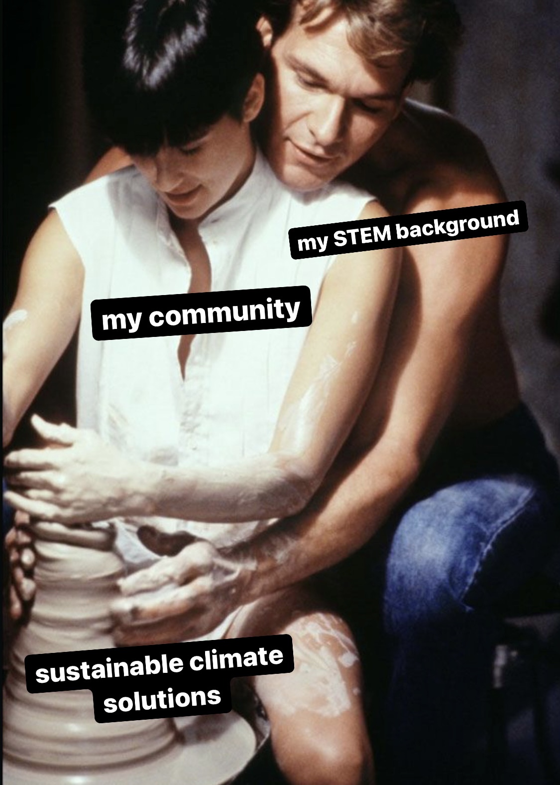 [Image description: the romantic clay-molding scene from Ghost, where Demi Moore is labeled “my community”, Patrick Swayze is labeled “my STEM background”, and the clay is labeled “sustainable climate solutions”.]