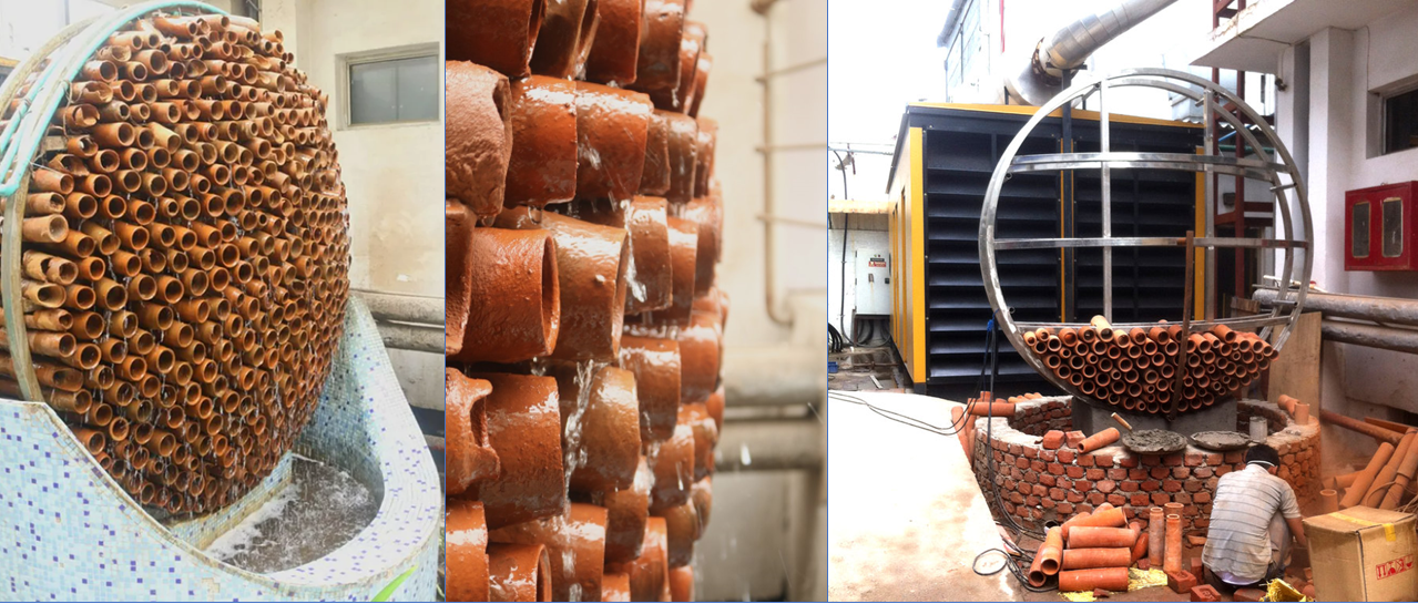 [Image description: The terra cotta heat exchanger designed for a factory in India. As long as the clay tubes are wet, the air passing through them gets cooled by 6 °C. Photos courtesy of Ant Studio.]