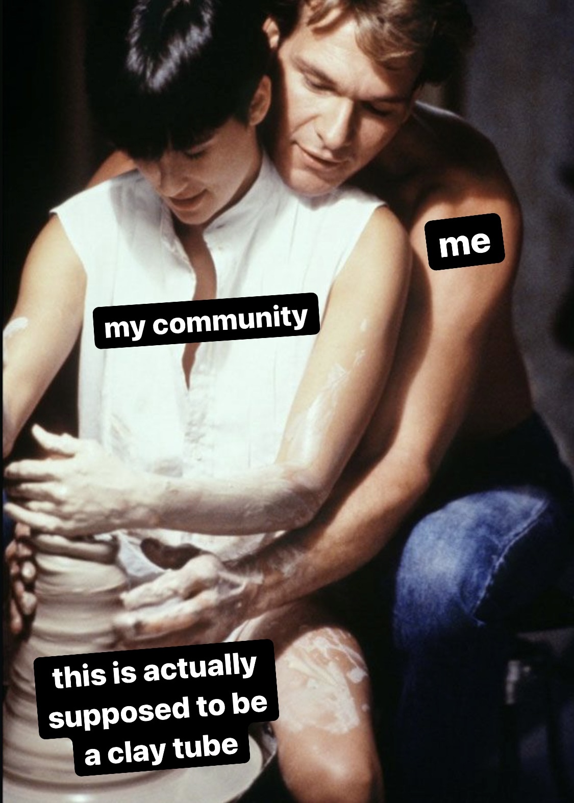 [Image description: ditto, except Patrick Swayze is labeled “me” and the clay is literally clay.]