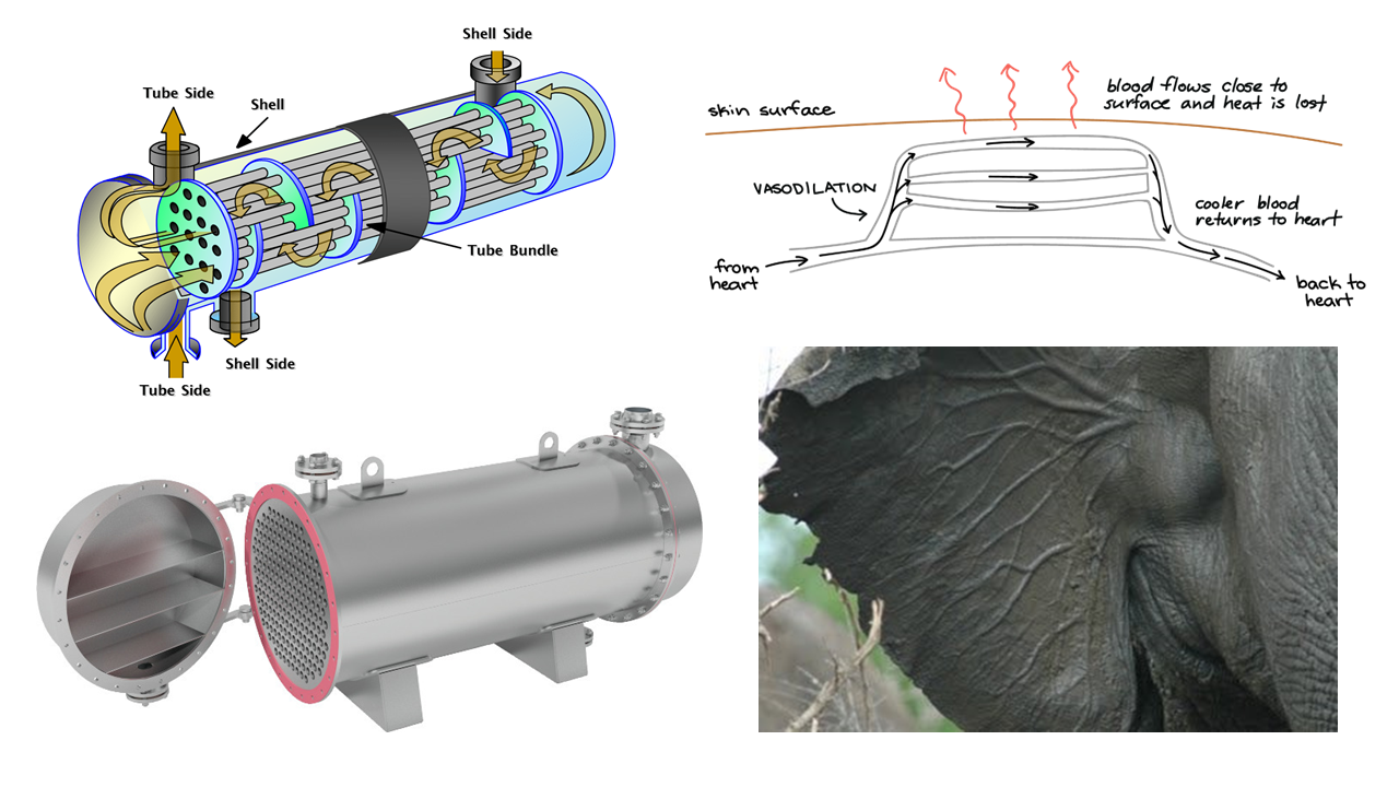 [Image description: Science imitates nature. Left: A shell-and-tube heat exchanger schematic (top) and heat exchanger IRL (bottom). Right: A diagram of thermoregulation in nature (top) and an elephant ear (bottom).