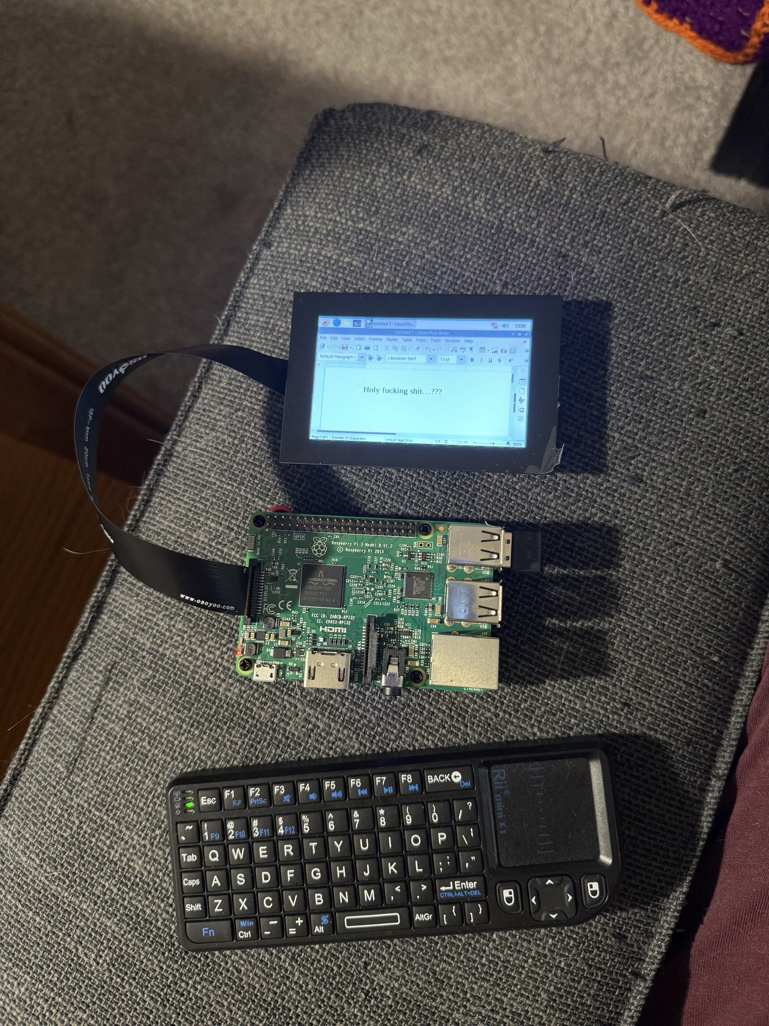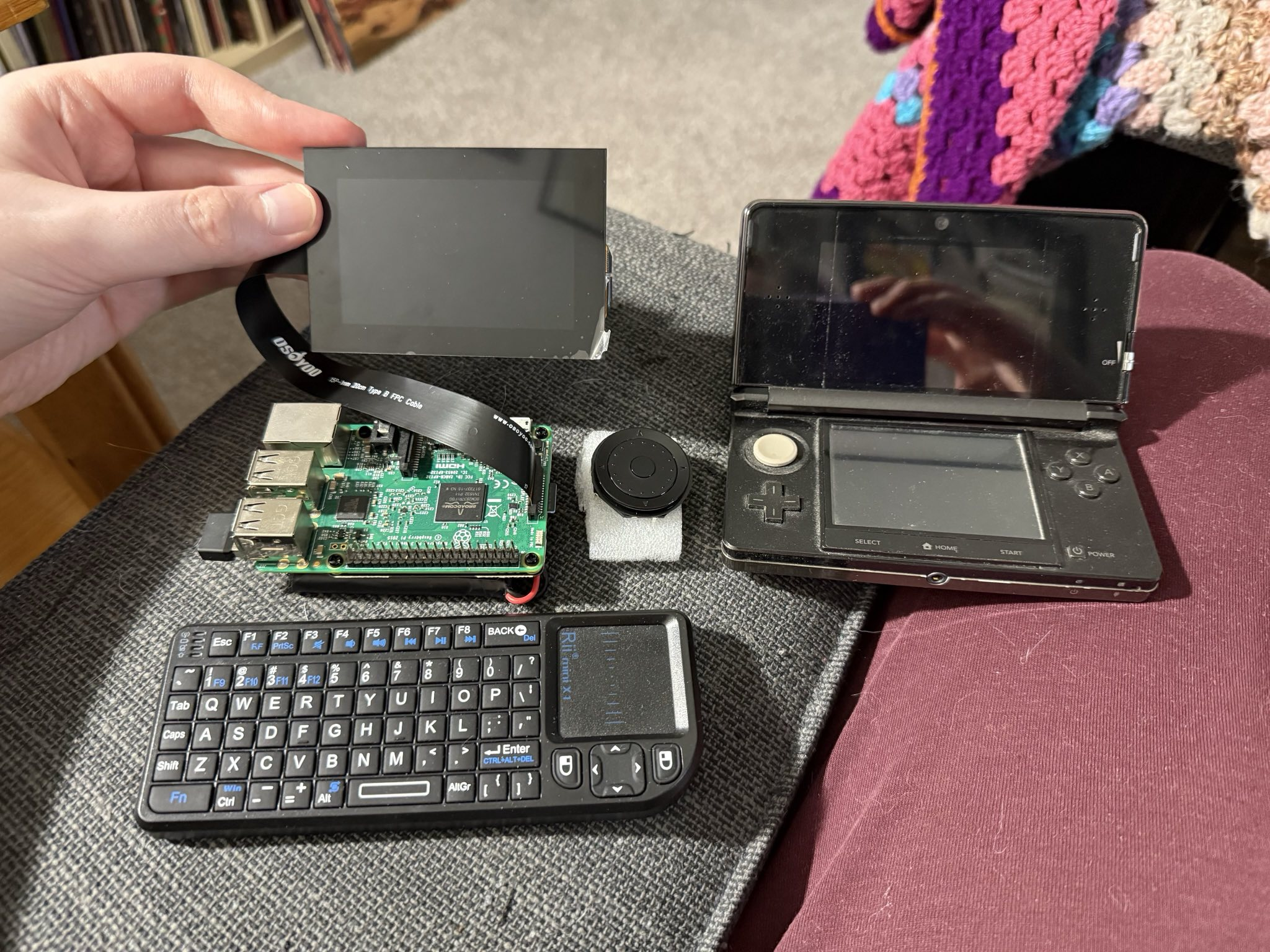 This one is in the very early stages. My partner also had a Raspberry Pi 3B, which is essentially a very tiny computer that runs a form of Linux. Pulling from cyberpunk fiction, I wondered if I could design a portable PC in a Nintendo DS-like form factor. So, I purchased a compatible touch screen, a tiny wireless keyboard, and a battery pack that would allow the device to work while not plugged into a wall. Sure enough, it all worked!