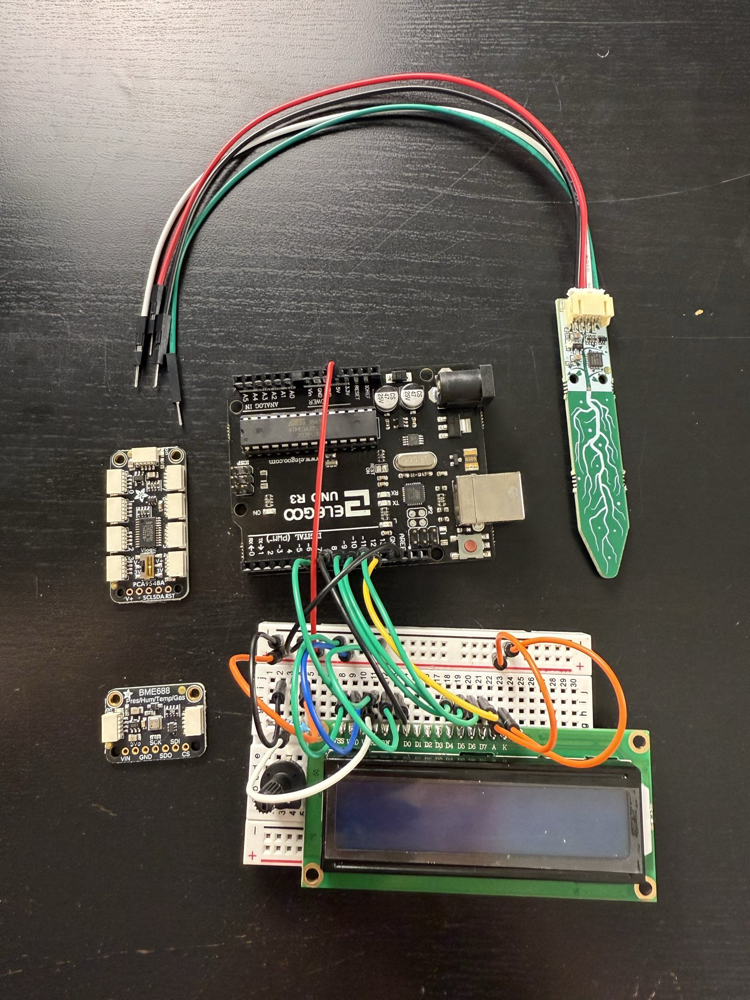 The system I designed cost less than $100 and includes two capacitive soil sensors, a 4-in-one temperature/humidity/pressure/VOC sensor, and an LCD screen for readouts. Once I actually finish the system (I bought the wrong cables for the sensors, haha), my partner will be able to stick the soil sensors into their potted plants and use a button to cycle through the moisture levels in the soil as well as temperature in the room, etc.