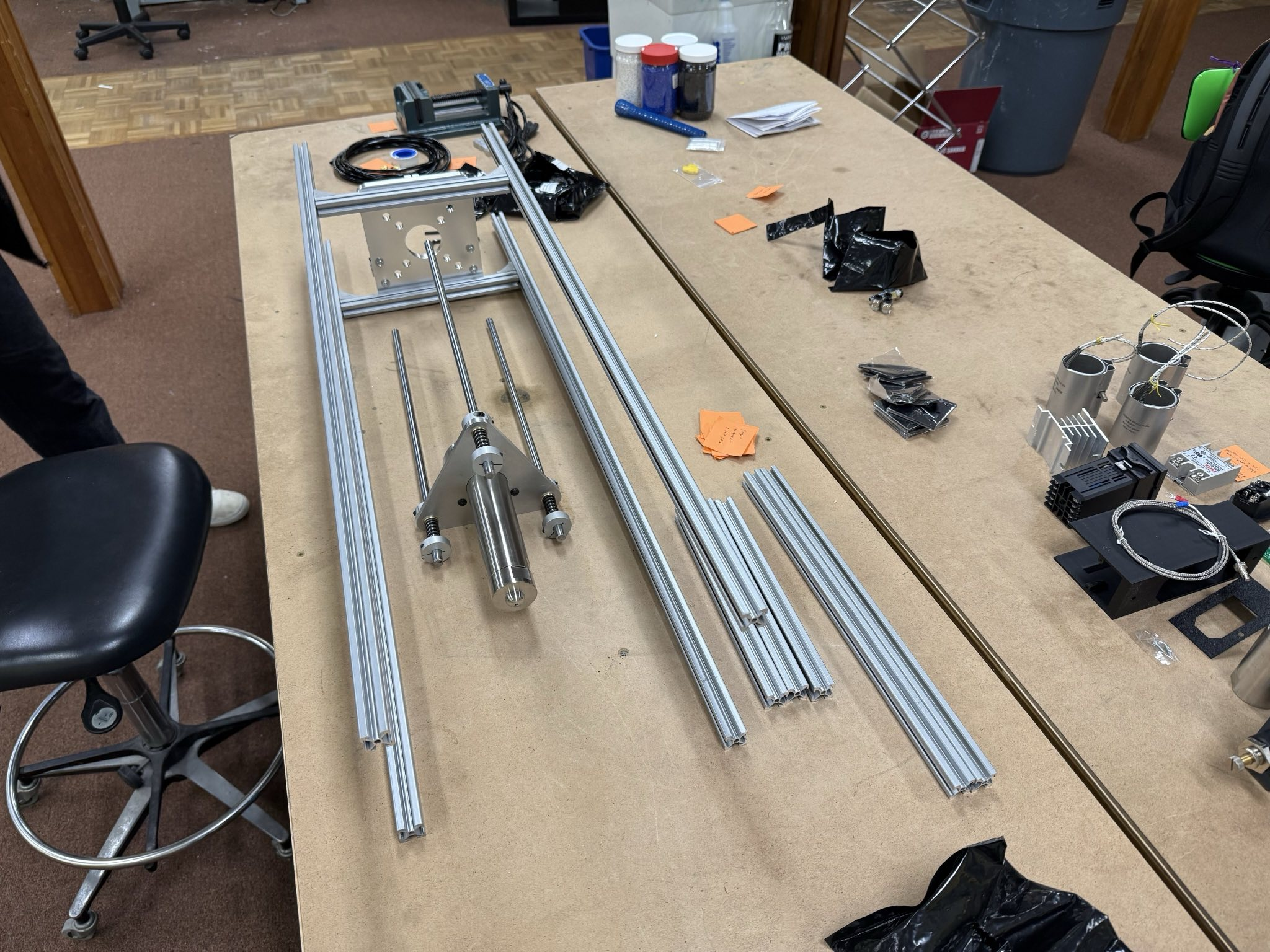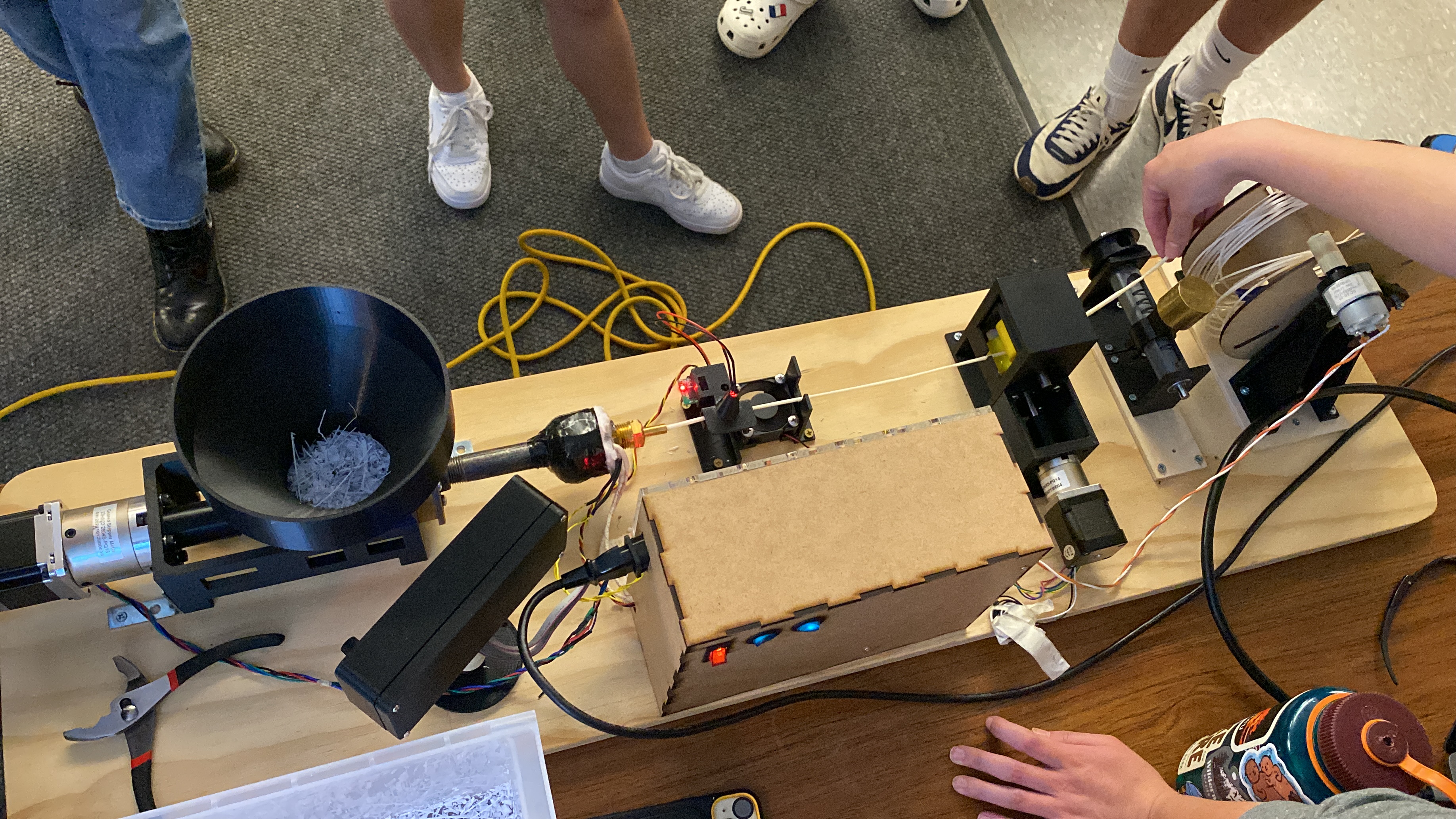 That’s where The Hive comes in. The Hive is a cooperatively-owned makerspace in Greenfield, MA whose members are very interested in hands-on, community-based recycling (think Precious Plastics machines). Last Spring, some students at Smith College built a plastic shredder as well as an extrusion machine that can turn take 3D printed parts (or scraps from the 3D printing process), shred them into plastic bits, melt them down, and extrude the parts back into 3D printer filament, creating a closed-loop recycling process. This was extremely cool and I actually had the students visit my ChE 583 class in 2024…