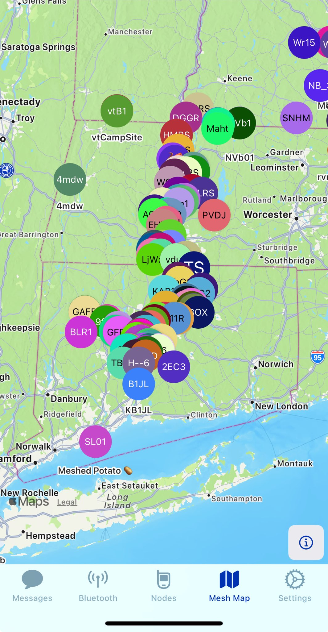 Luckily, I’m not the only weirdo using Meshtastic in Western Massachusetts; on the iPhone app, you can see a map of all the nodes that have GPS functionality (don’t worry, you don’t have to share your location with the world; the cheaper devices don’t have GPS, anyway). You can buy a credit card-sized device with a GPS for when you lose your wallet, though!