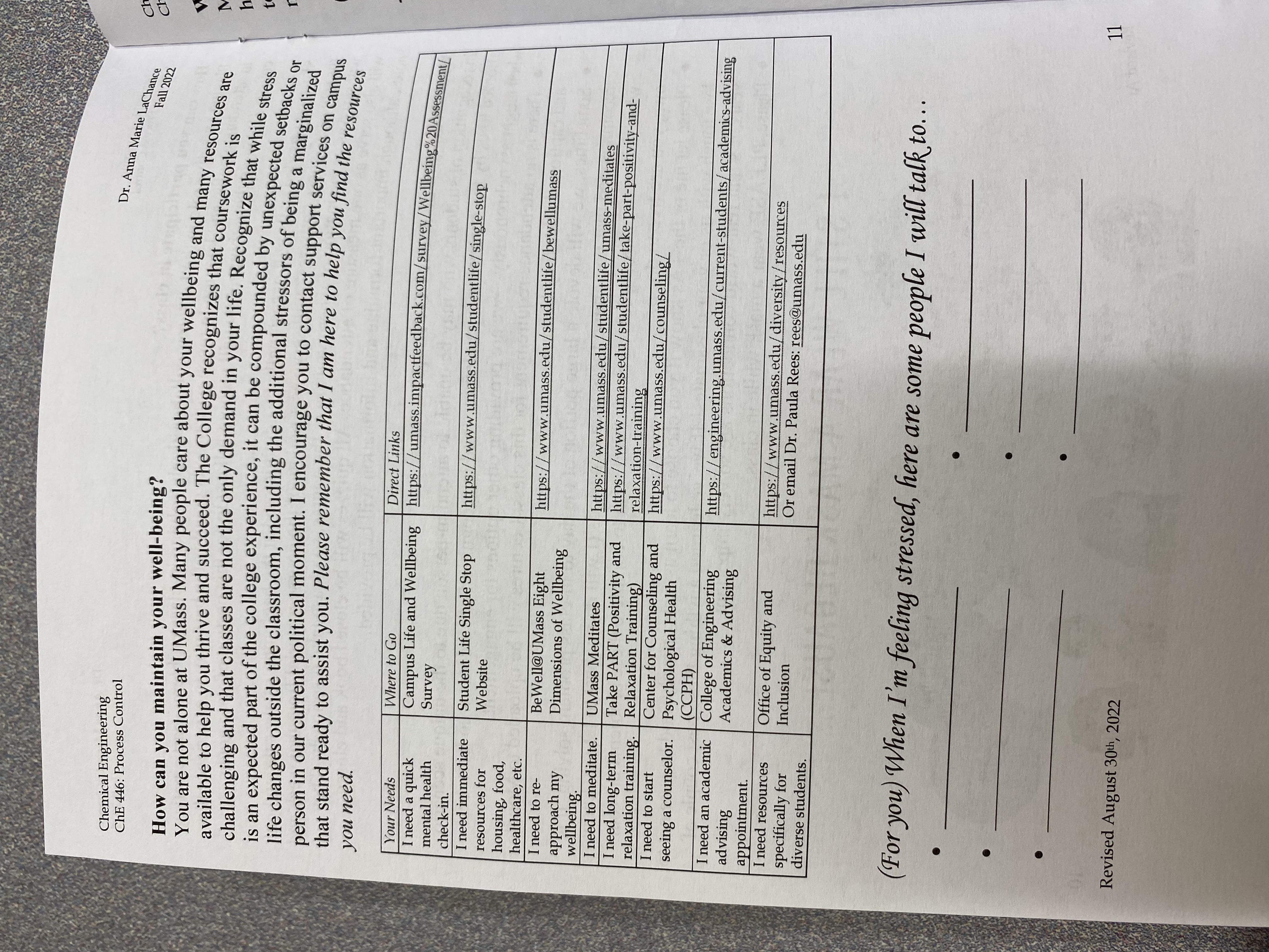 I’m also proud of this table of on-campus resources. I curated this myself, with sites for student mental health resources, direct aid like food or housing, academic advising, and more. I also prompt students to write down people in their life they can talk to, so that later in the semester when they’re stressed about their Senior year, they can look to this list and remember that they’re cared for.