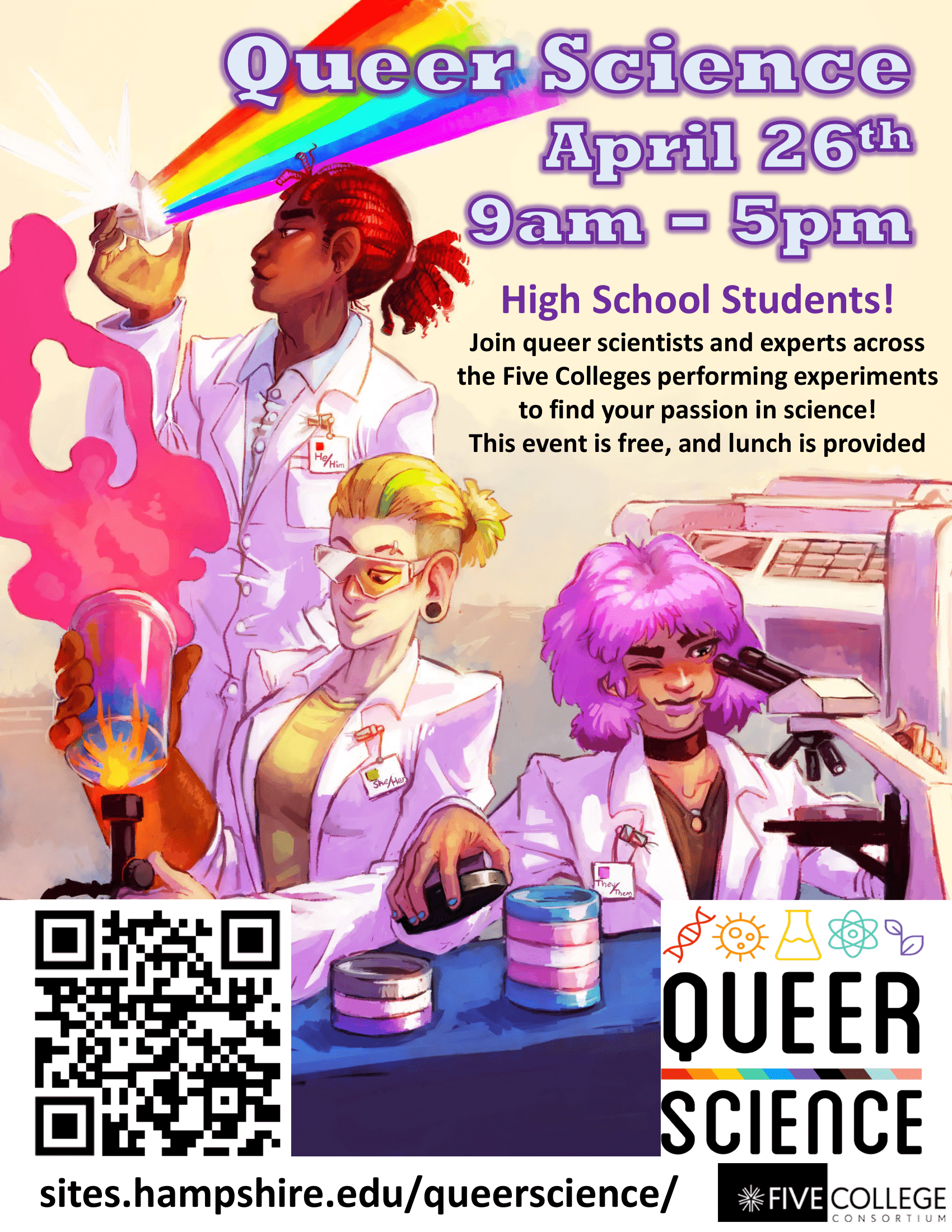 In this FREE day-long event, high school students can visit Hampshire College to network with LGBTQ+ STEM professionals, participate in demonstrations from various STEM fields, meet other young aspiring scientists, and crucially, get some free food!