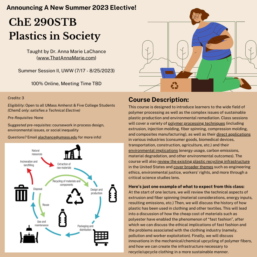 Also, my summer course is now registered with SPIRE! If you’re a Five College student in Western Massachusetts, you can take my “Plastics in Society” class during Summer Session II. This is essentially my Polymer Processing & Sustainability course, but curated for a general, non-ChemE audience.