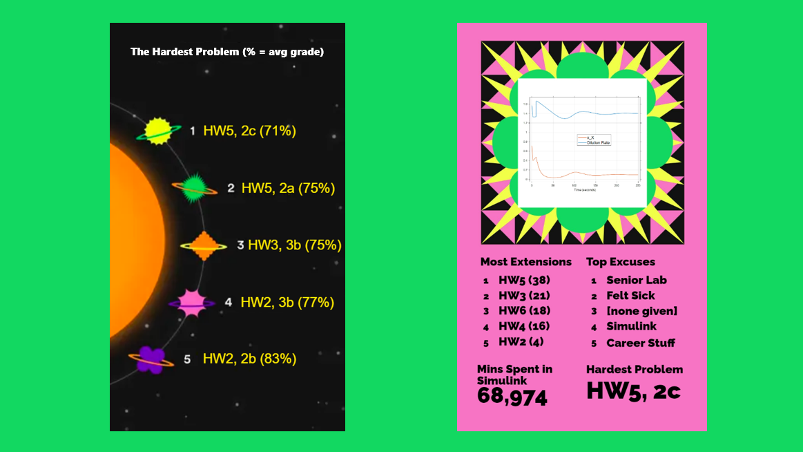 I finished up with two summaries in the actual 2022 Wrapped style. I used the “Top Genres” format to rank the hardest homework problem of the semester (of the ones graded up to that point). Throughout the semester, I have my TAs track the point distributions across individual parts of individual problems so that in future semesters I can know which problems to change (or scrap entirely). I thanked my students yet again for their perseverance, letting them know that they walked so that future students could run. On the right, I made some jokes about how long they must have spent in MATLAB, as well as their “Top Excuses” for asking for homework extensions (there were just made up by me, and not quantitative at all).
