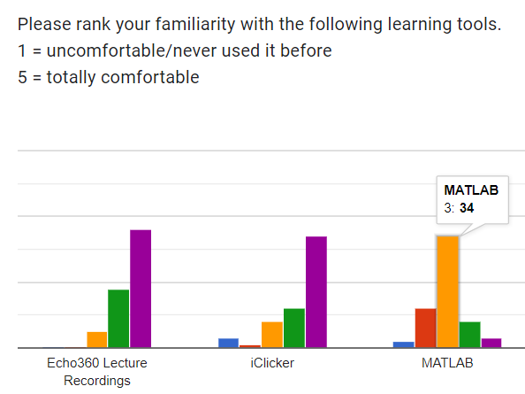 For this next slide, I wanted to demonstrate how far they’ve come. At the beginning of the semester, I polled them about numerous course-related items, from how well they knew other people in the class to what learning tools they were familiar with. Somehow, this particular group of Seniors weren’t that familiar with MATLAB, a tool that I had been planning to use in the course. Normally, UMass students learn MATLAB very early on in their Engineering degree program. But thanks to COVID-19, this group wasn’t attending UMass during the semester they were taking their MATLAB course; they were attending Zoom University, which had affected their retention of these skills.