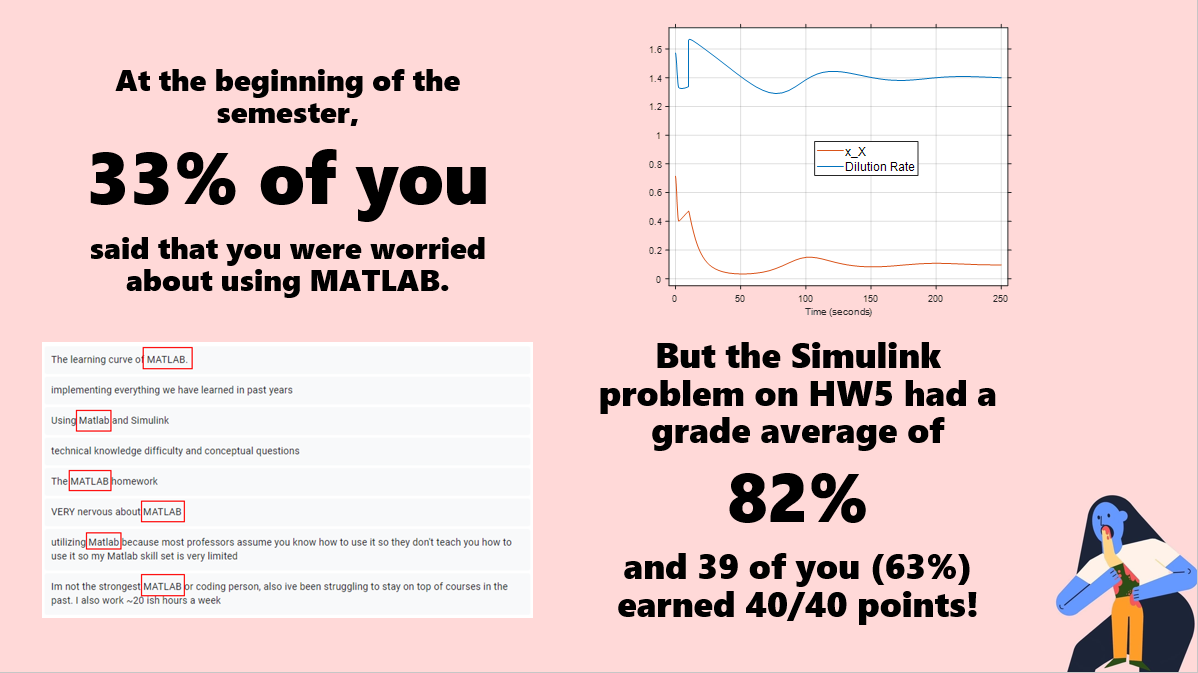 In the same poll, 33% of students responded to the open-ended question “What are you most worried about in this course?” saying something about how the course was going to use MATLAB. So, rather than putting them through the gauntlet of coding their own S-functions, I made my MATLAB problems a bit simpler, with my most challenging problems having them modify pre-written code to do something new (which I also showed them how to do using in-class problems).