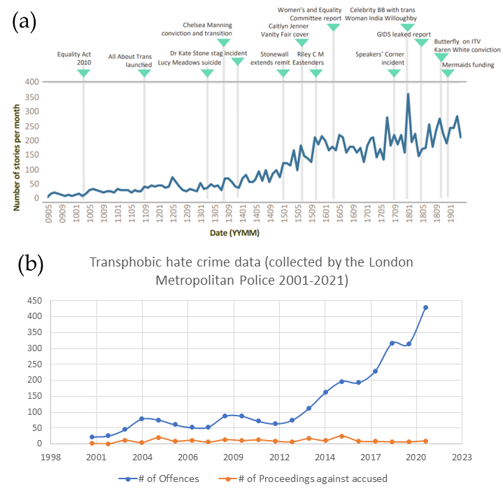 Take this data from TERF Island (er, I mean the United Kingdom) comparing the number of articles written about trans people and the number of anti-trans hate crimes over several years. It’s difficult to look at this and say that the media is, in general, a neutral force for education.
