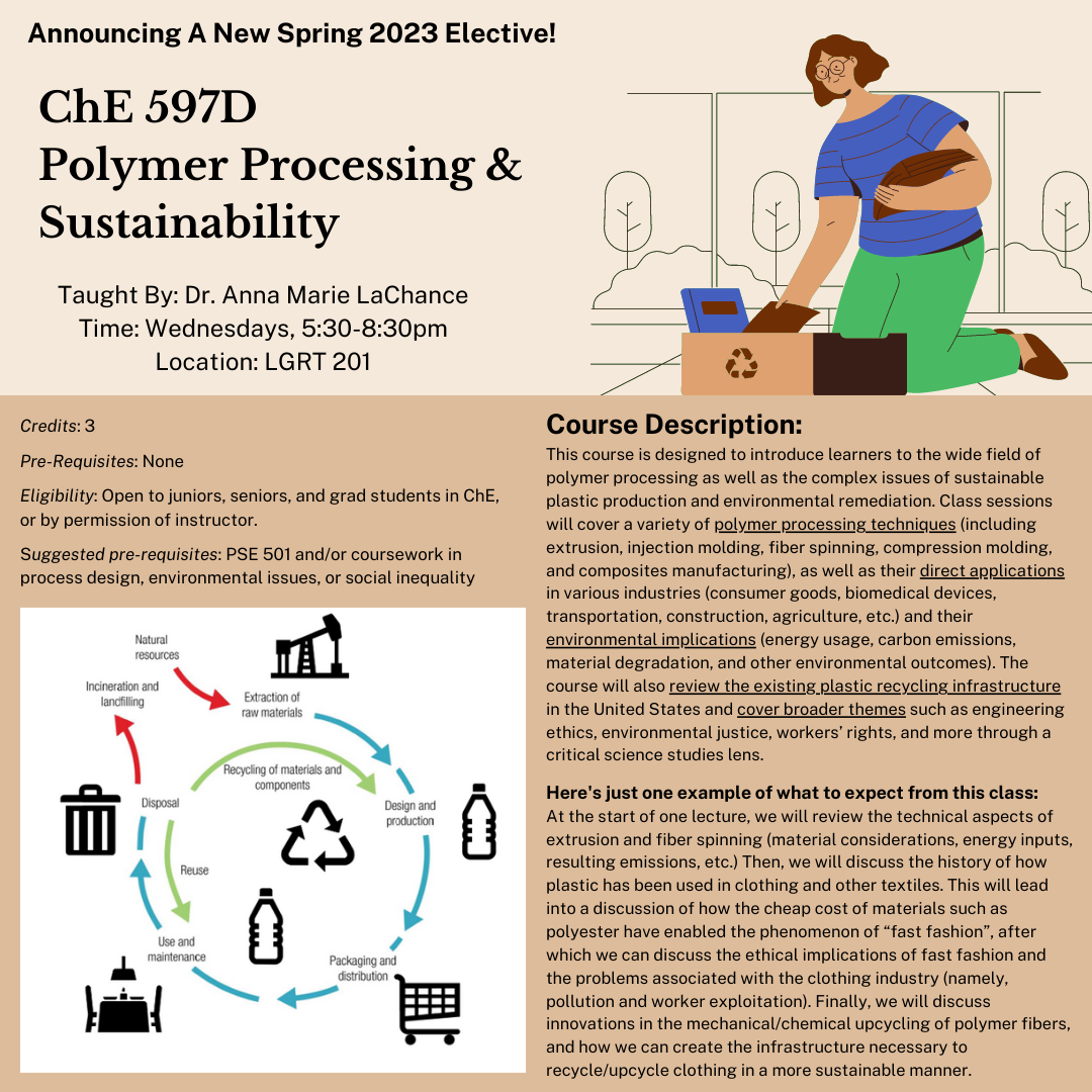 Basically, I’m trying to make a course that’s “peak ChemE”. Not just thinking about chemical reactions, energy inputs/outputs, and emissions, but also about what we do with plastic when we’re done with it, environmental justice values of “who” makes engineering decisions/“who” deals with the consequences, and coming up with solutions for what infrastructure needs to be implemented to deal with the problem of plastic pollution. By virtue of being systems thinkers, I feel as though chemical engineers are particularly suited to solve the problem of plastic pollution. However, there isn’t yet a course at UMass that trains them on the specifics of this particular system (plastic life cycles, chemical upcycling, etc.) So, I’m filling that gap myself!