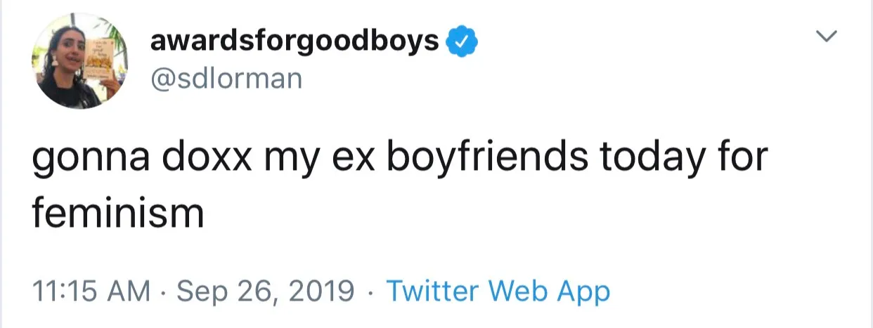 A tweet by Awards For Good Boys author Shelby Lorman (who also wrote a good essay on West Elm Caleb): “gonna doxx my ex boyfriends today for feminism”