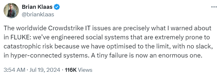 Crowdstrike is one of the leading brands for cybersecurity software, controlling ~18.5% of the cybersecurity market. In other words, roughly one in five computers that uses advanced cybersecurity runs their software. So when this buggy update got pushed out, it caused the Windows computers in businesses around the world to get the dreaded Blue Screen of Death (BSoD). This led to some hilarious memes, but more importantly, it led to some pretty alarming shutdowns. Major airlines, banks, and emergency services were down for hours before a new update could be pushed out and repaired. One take from “FLUKE” author Brian Klaas is prescient here…
